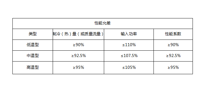 中溫型壓縮機(jī)或壓縮機(jī)組的制冷量、熱量或質(zhì)量流量應(yīng)大于等于92.5%,輸入功率小于等于107.5%,性能系數(shù)大于等于92.5%。